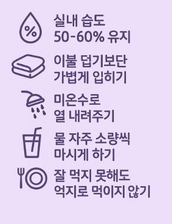 미온수로 몸을 닦아주거나 가볍게 옷을 입히는 것도 도움이 됩니다. 단, 아이가 떨면 체온 유지가 먼저예요.