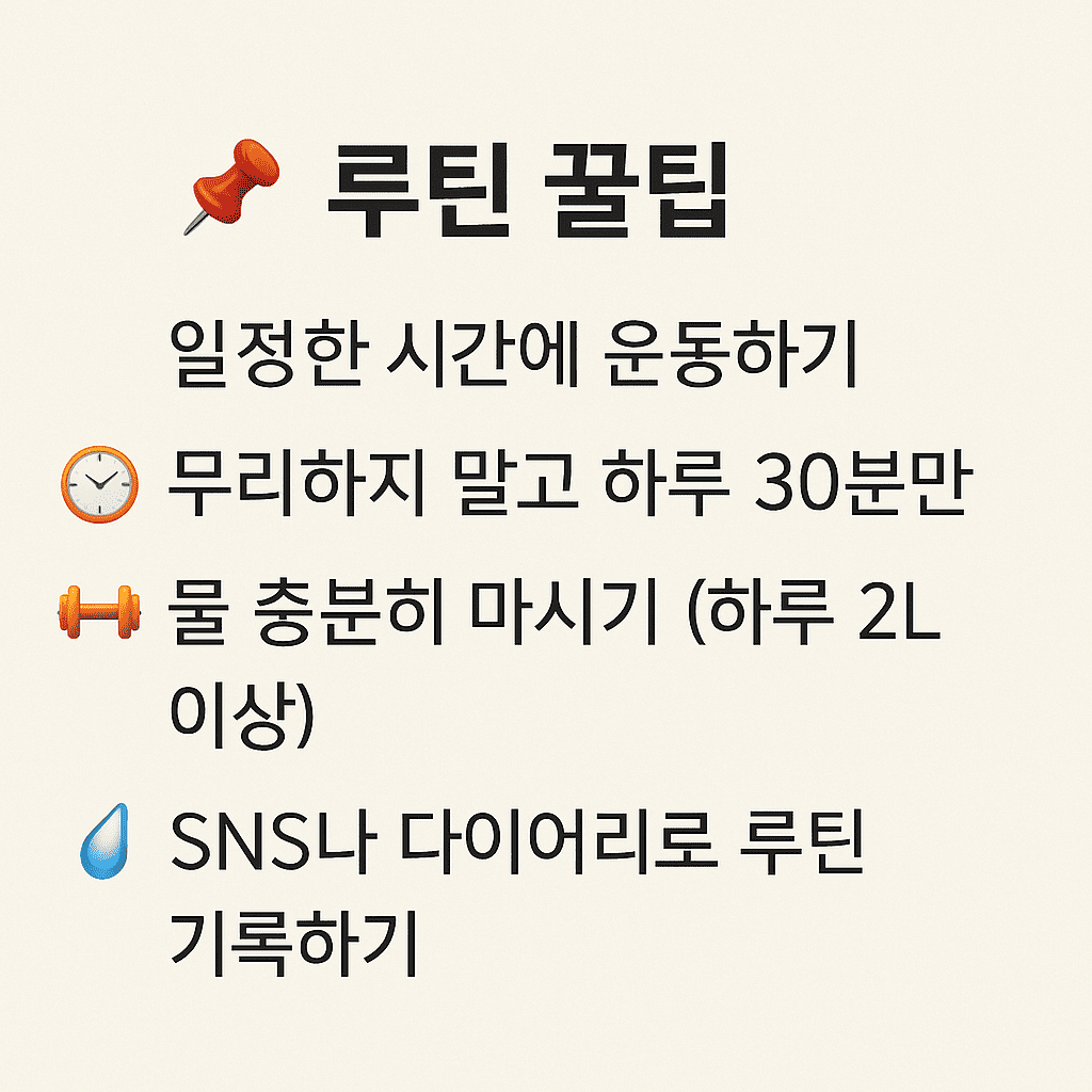 운동은 꾸준함이 전부예요. 그래서 저는 매일 이 리스트를 확인하면서 스스로 동기를 불어넣고 있어요. 여러분도 아래 체크리스트로 루틴을 유지해보세요. ✅
