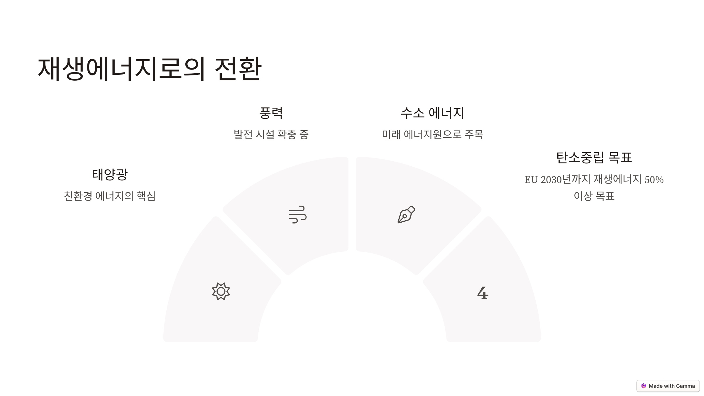 - 유럽연합(EU)은 2030년까지 재생에너지 비율을 50% 이상으로 높일 계획입니다.