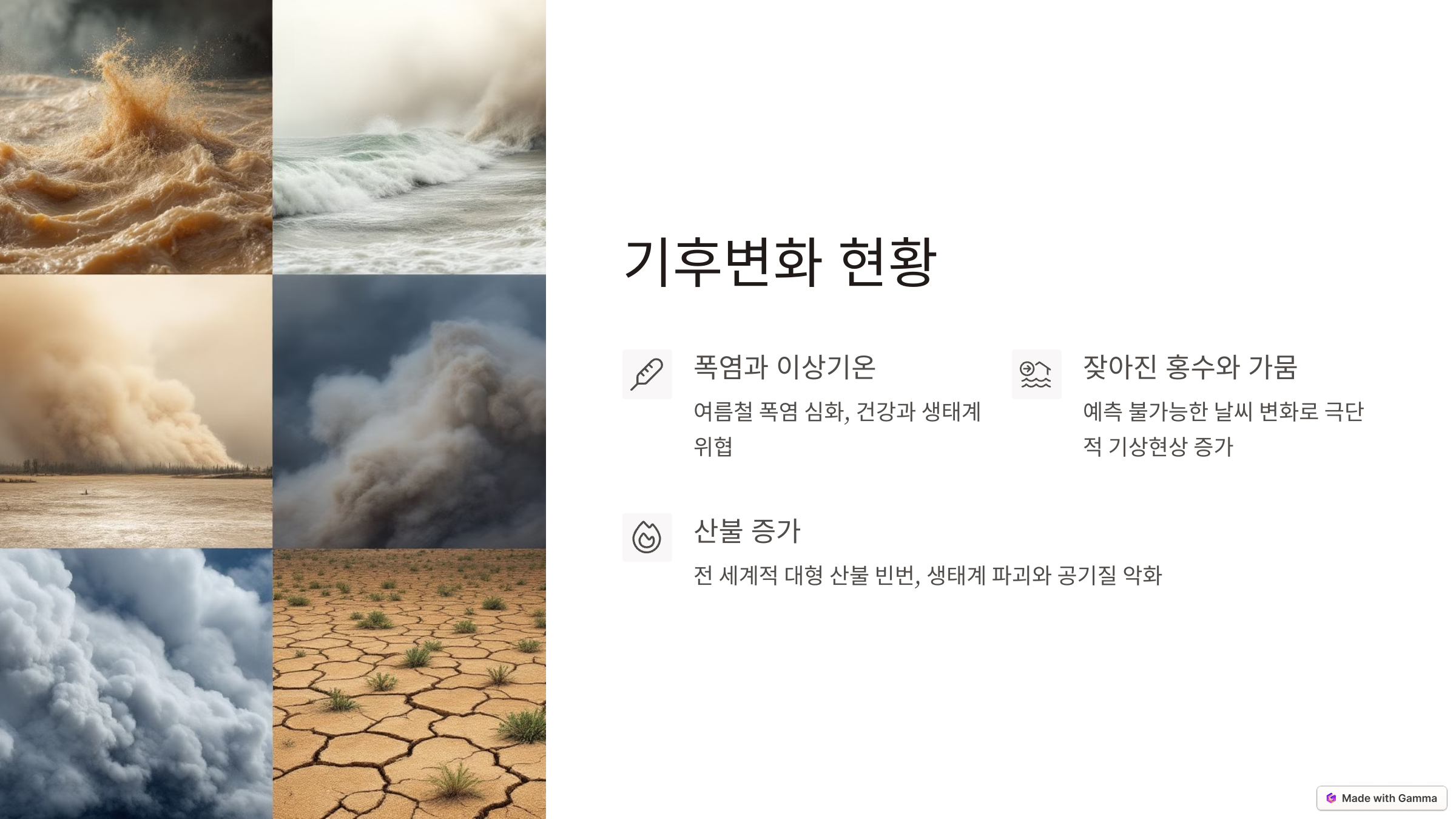 기후변화는 지구의 평균 기온 상승뿐만 아니라 다양한 환경 변화를 의미합니다. 최근 몇 년간 전 세계 곳곳에서 극단적인 기상 현상이 빈번하게 발생하고 있습니다.