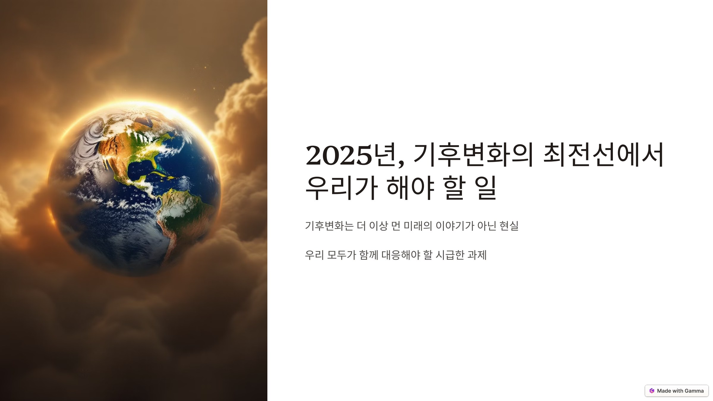 한때 기후변화는 먼 미래의 이야기처럼 들렸습니다. 하지만 이제는 뉴스에서, 날씨에서, 그리고 우리가 살아가는 환경 속에서 기후변화를 실감하지 않을 수 없는 시대가 되었습니다. 2025년, 기후변화는 더 이상 피할 수 없는 현실이며, 우리는 이 변화를 어떻게 받아들이고 대응해야 할지 고민해야 합니다.